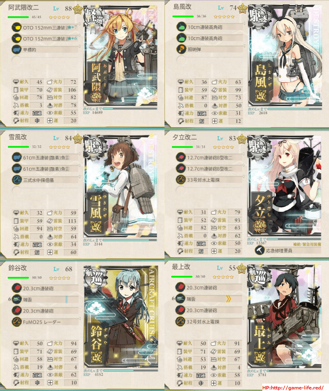 阿武隈改二Lv88:OTO 152mm三連装速射砲★7/OTO 152mm三連装速射砲★6/甲標的